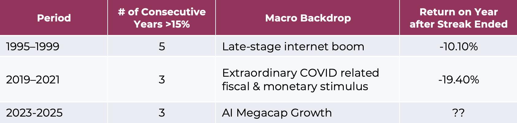 History reinforces this point. Since 1927, the S&P 500 Composite (including predecessor indices) has delivered three or more consecutive calendar years of returns exceeding 15% on only two other occasions: during the late-stage dot-com expansion from 1995 to 2000, and during the liquidity-driven COVID period from 2019 to 2021, the latter fueled by an unprecedented combination of fiscal and monetary stimulus. While history never repeats perfectly, it serves as a reminder that extended periods of outsized returns are typically followed by phases of consolidation or normalization, rather than uninterrupted gains. This is not a near-term forecast; however, recent performance has been highly concentrated within a narrow group of AI-exposed mega-cap companies, implying that sustained index-level returns will ultimately depend on a broader diffusion of AI-driven productivity gains and/or a more accommodative monetary backdrop, rather than continued mega-cap leadership alone.