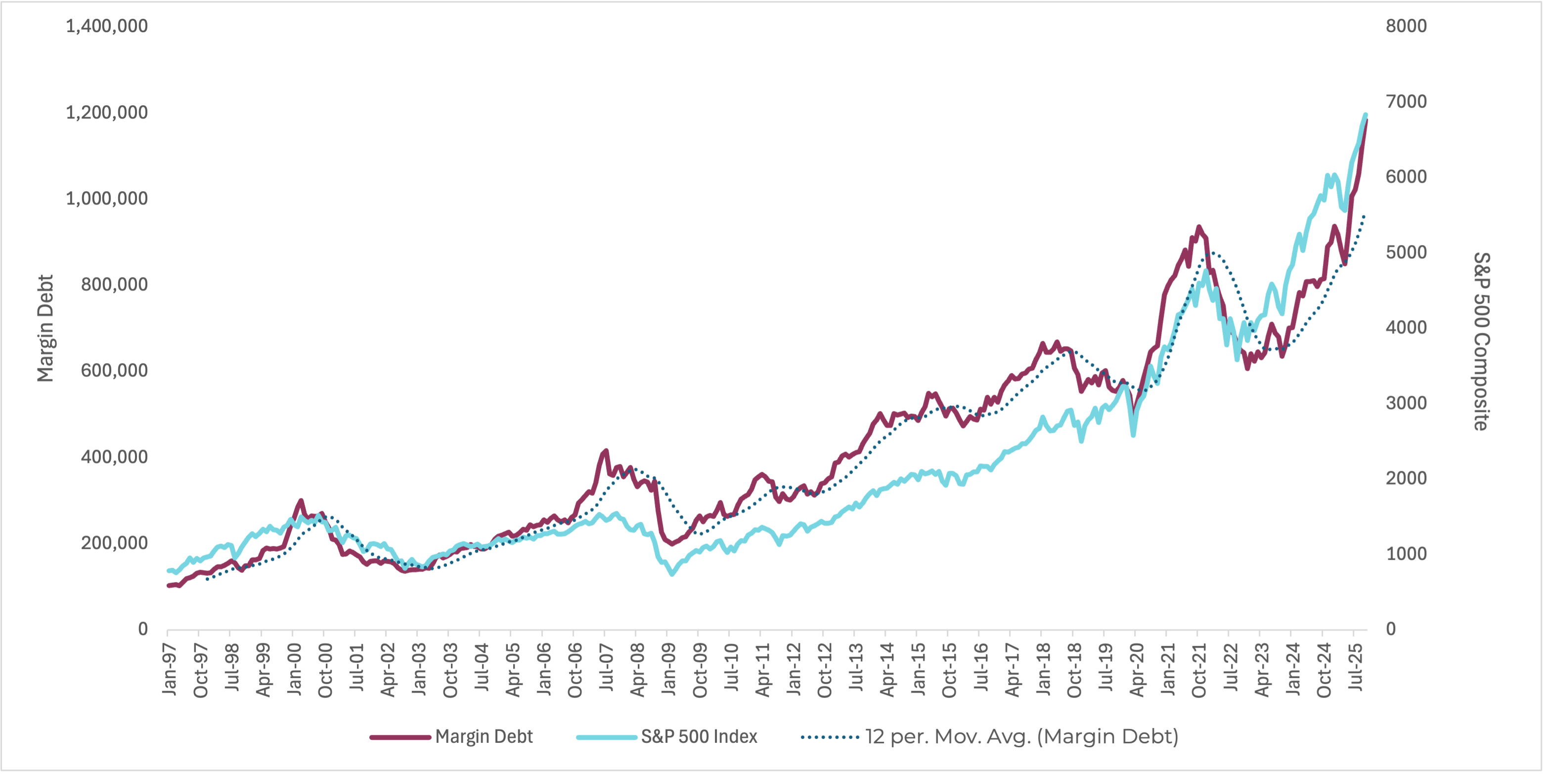 While we believe the debasement regime supports a long-term secular bull market, this does not preclude the occurrence of cyclical bear markets. In fact, systemic risks appear to be rising. Higher yields can introduce nonlinear shocks into leveraged parts of the financial system, as seen in 2022 with long-duration UK gilt exposures within pension funds and the rapid repricing of U.S. regional banks’ held-to-maturity portfolios. Today, margin debt levels sit near all-time highs, increasing the sensitivity of markets to drawdowns. Should risk assets decline beyond a critical threshold, margin calls can force rapid deleveraging and forced selling, amplifying market moves and triggering broader stress through liquidity events, policy missteps, or exogenous shocks — not solely through a traditional economic recession.