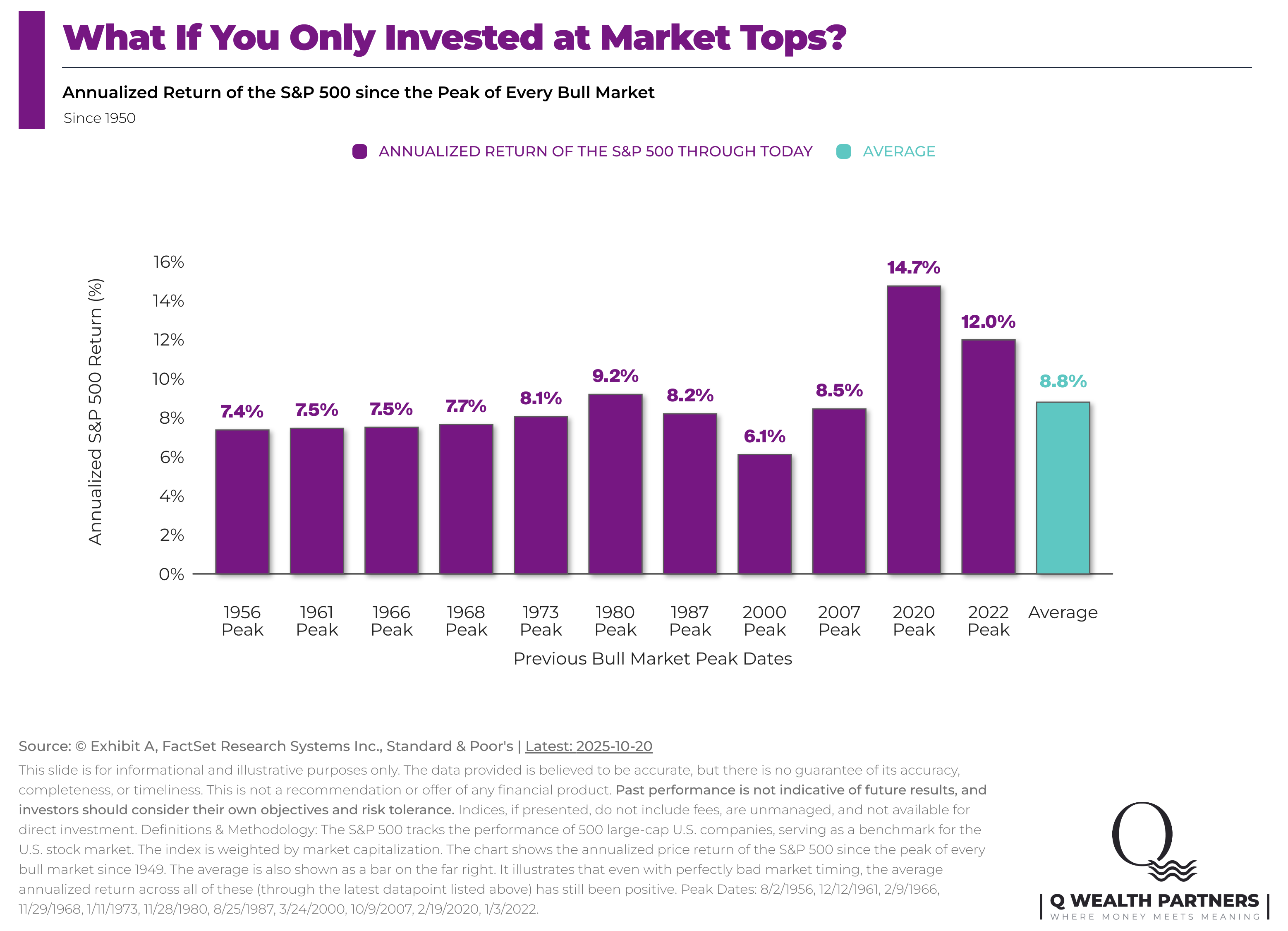 The fear of “buying at the top” remains one of the biggest behavioral hurdles investors face. It can feel reckless to commit capital when markets are at all-time highs, but as history shows, the risk of not investing can be even greater.