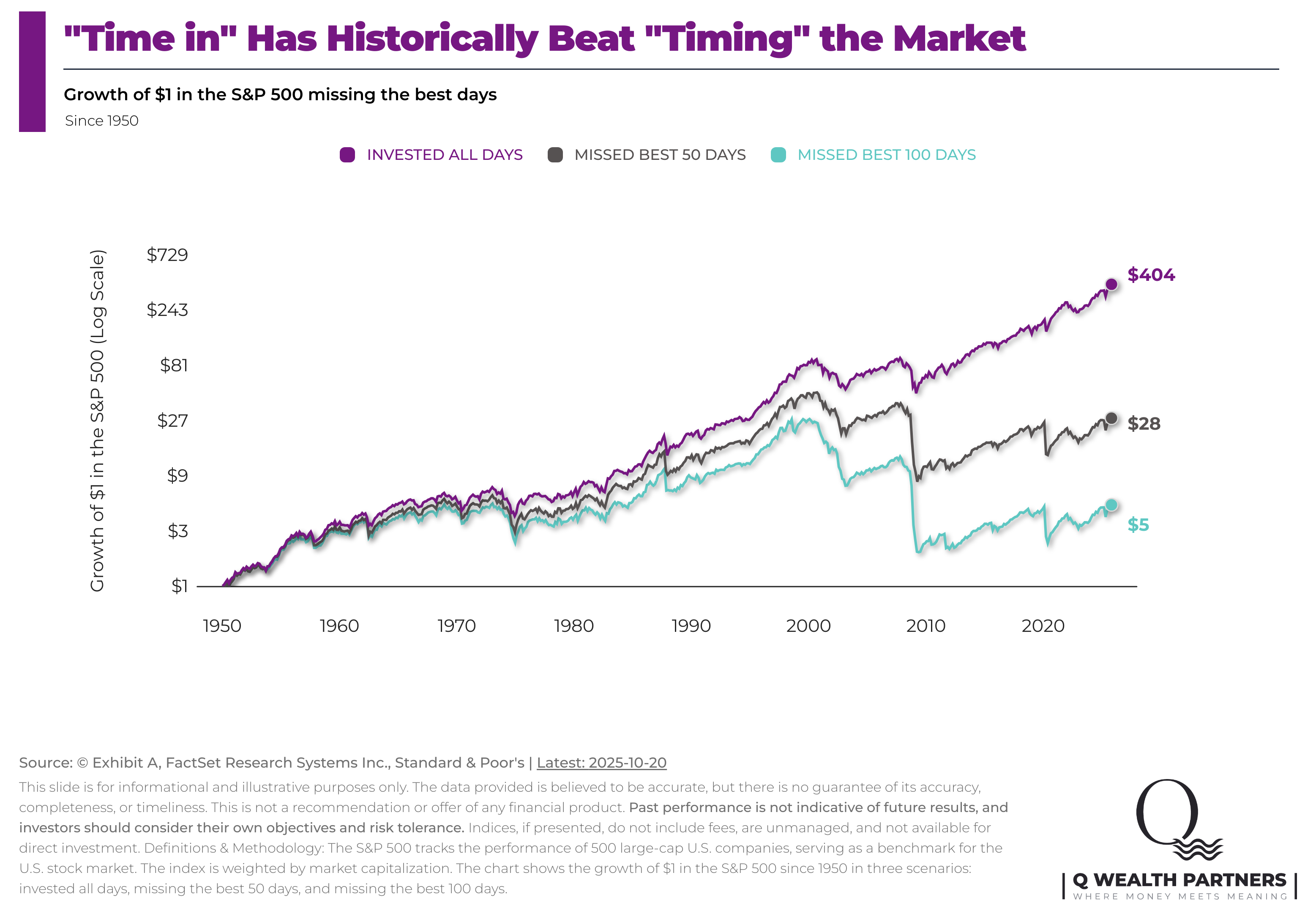 The danger is that market timing often causes investors to miss more upside than the downside they avoid. Calling the top is difficult, but calling the bottom—and knowing when to get back in—is equally, if not more, challenging.