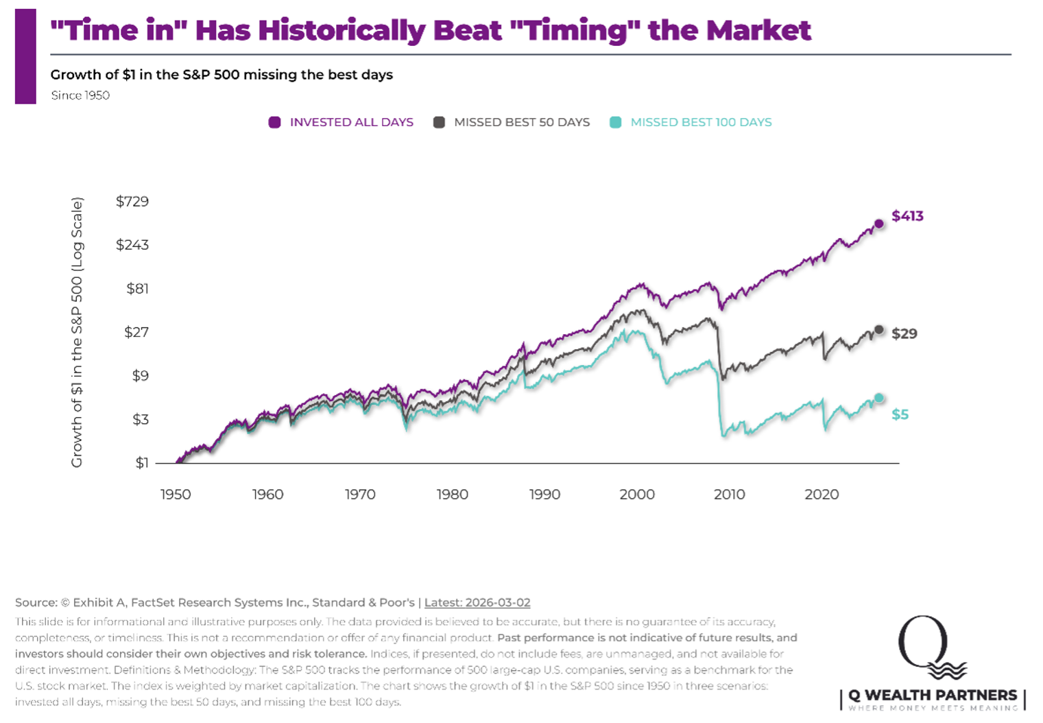 - $1 invested in the S&P 500 grew to $413 when fully invested.